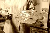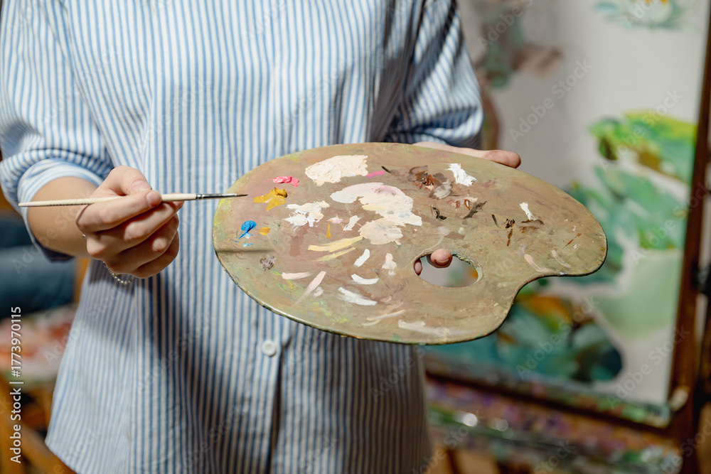 Artist holding a paint palette and brush, preparing to create artwork. Close-up of colorful oil paints on palette, creative studio atmosphere.