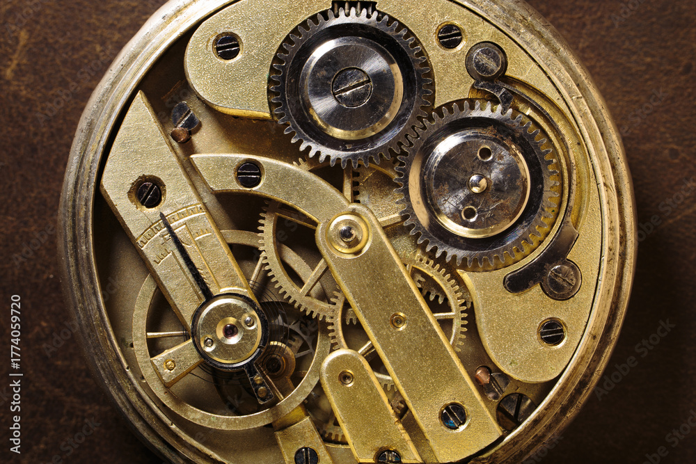 Clockwork old pocket watch. Macro shot. Vintage swiss clockwork mechanism