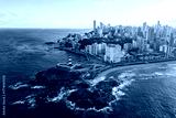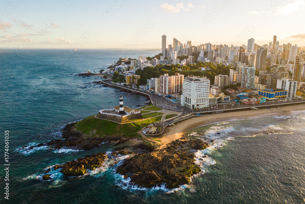 Aerial View of Barra Lighthouse on the Rock in the Ocean With Salvador Cityscape on Sunrise in Bahia State of Brazil