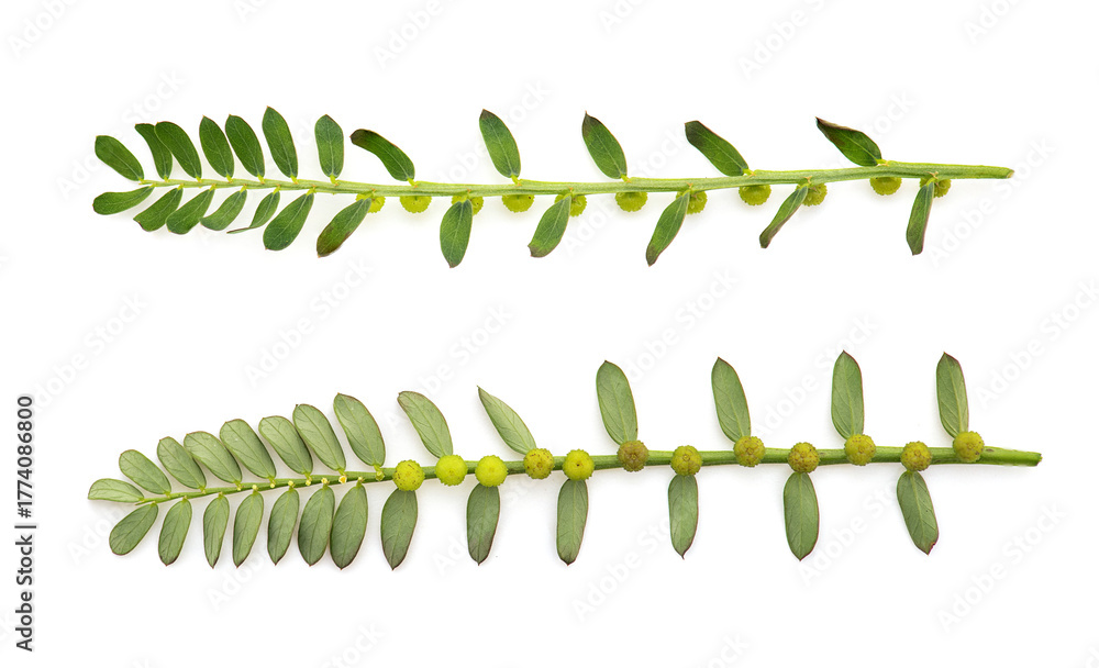 Phyllanthus niruri branch green leaves ans fruits isolated on white background.top view.