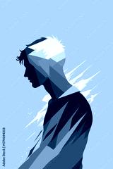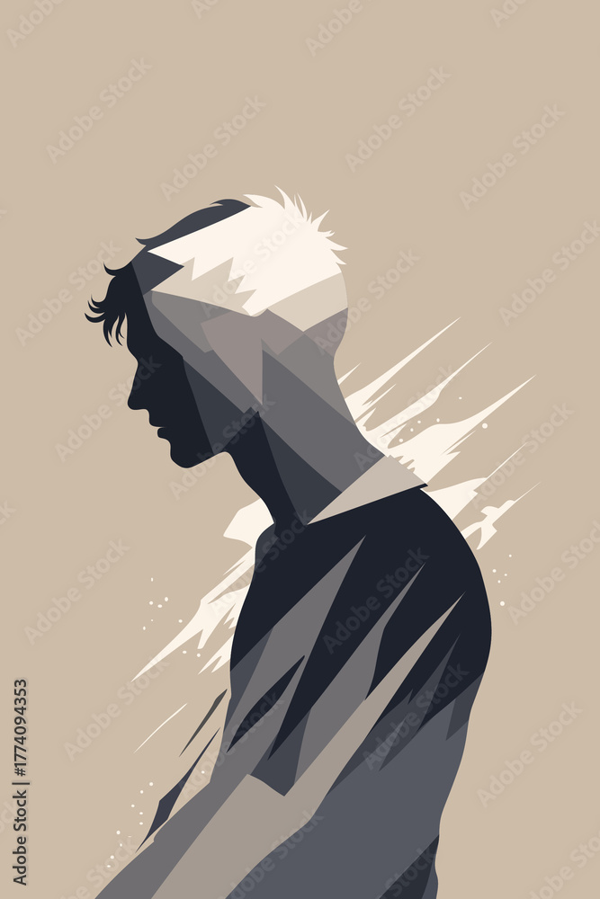 Abstract portrait of a man in shades of gray, symbolizing emotional struggle, trauma, and inner conflict in a minimalist modern art style representing mental health themes.