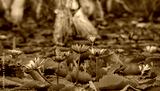 Close-up of purple lotus flowers blooming among green leaves in calm tropical wetland.