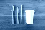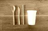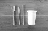 Bamboo wood cutlery, disposable fork, spoon,knife,straw and white paper cup made of natural material on wooden background.