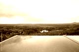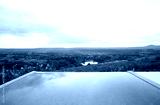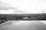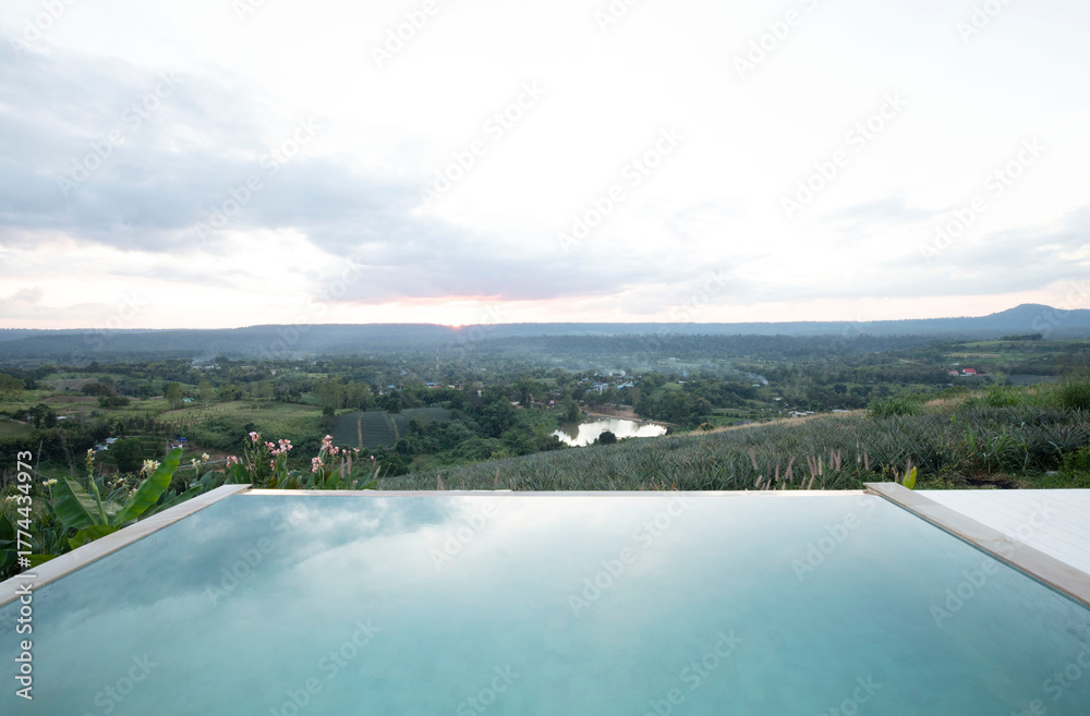 Swimming pool with scenic view of lush green forest and hills