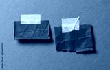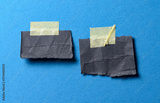 Pieces of black paper memo reminder notes with adhesive tape and copy space for text on blue background