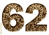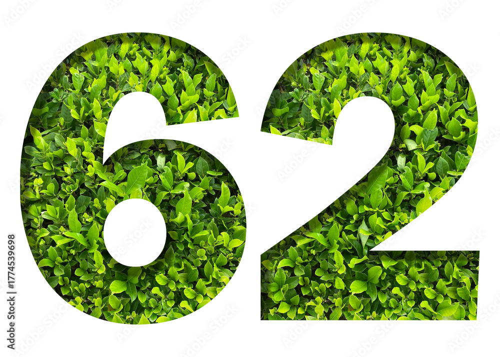 number 62 from green leaves isolated on transparent background. suitable for birthday, anniversary and memorial day templates.