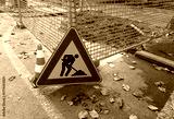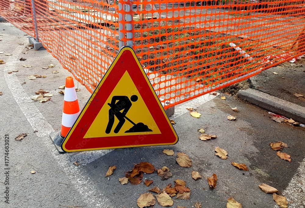 Road works warning sign on the road under construction with fallen leaves.