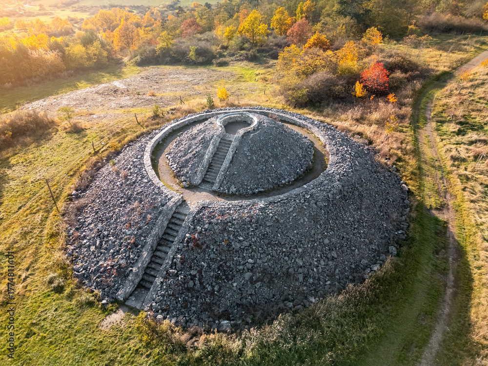 Aerial view of the Šlovický vrch observation tower – a stone mound resembling a Mayan pyramid, Pilsen Region, Czech Republic.