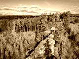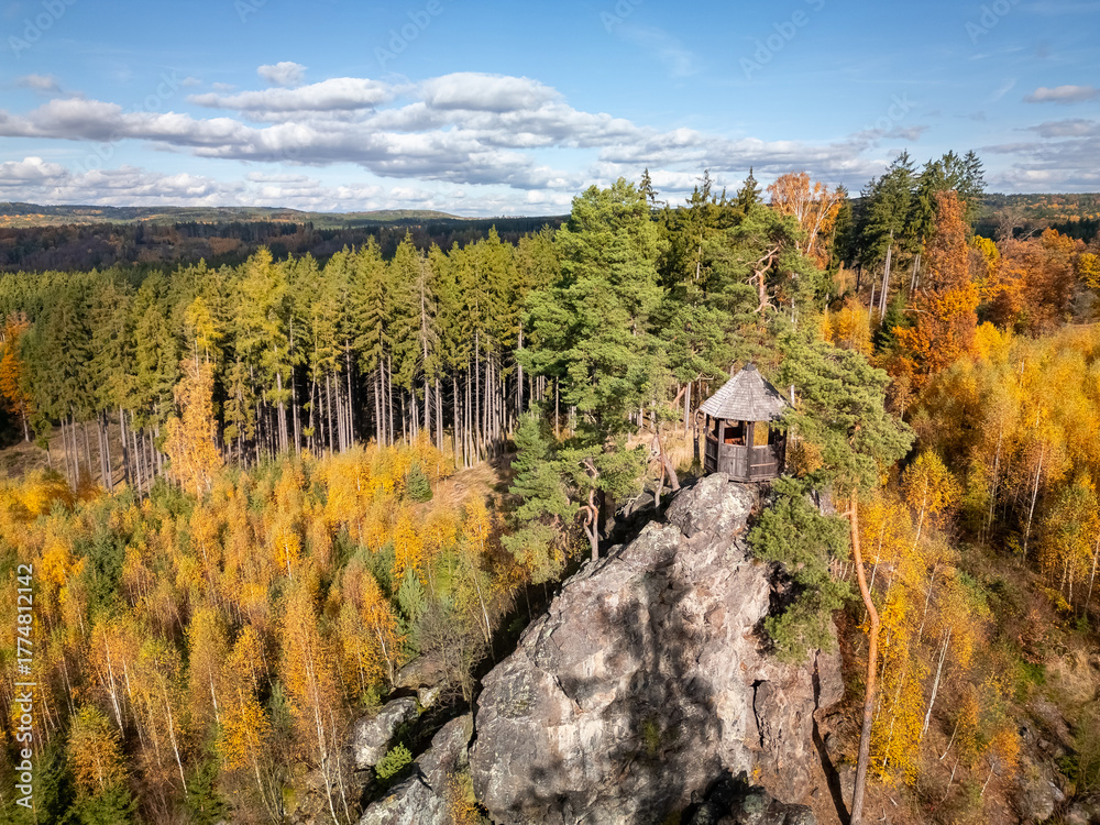 Observation hut in the beautiful deep forest. Autumn season in the woods with a wooden cottage atop the rocks.