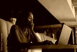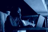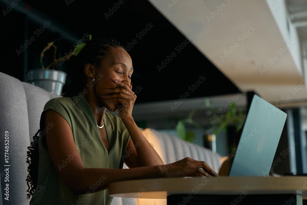 Exhausted black businesswoman yawning while working on laptop in office lobby