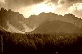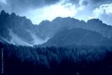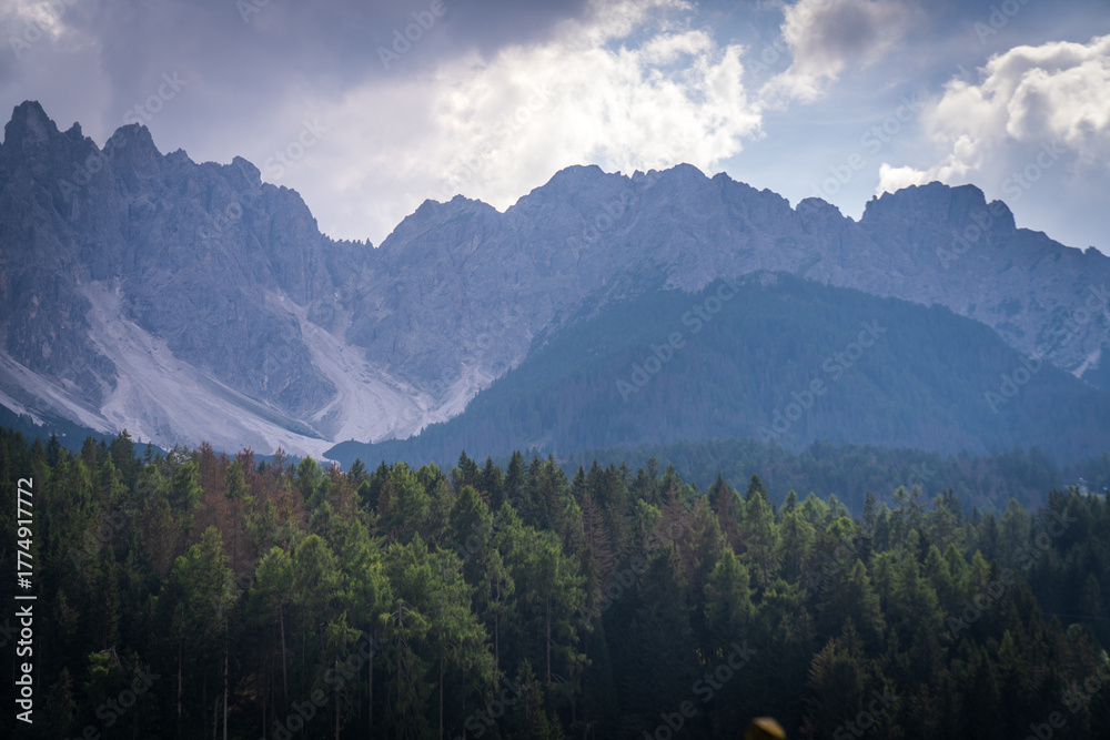 Dramatic Dolomites Ridge with Forest and Clouds, South Tyrol