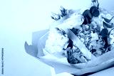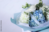 Elegant bouquet of white roses and blue hydrangeas with eucalyptus leaves, wrapped in pastel blue paper