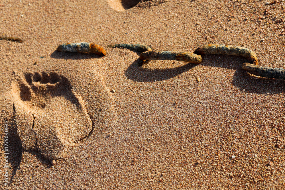 An old rusty iron chain buried in the sand on a beach with human footprints