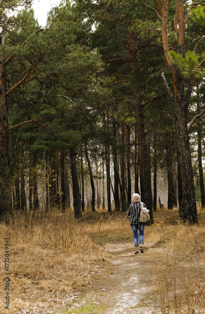 Active senior woman tourist with backpack enjoy stroll on eco forest path in warm fall day. Female wearing jeans, plaid shirt walks in woods park, breathing fresh air. Enjoying healthy activities