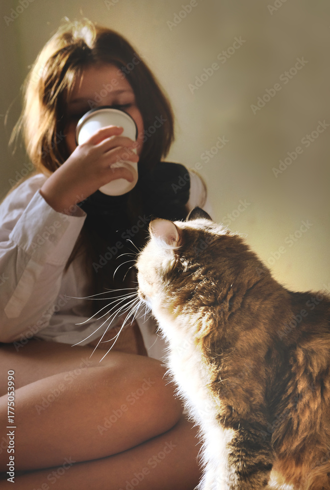 Pretty girl enjoying coffee, soft sunlight makes the chilly morning feel cozy. In the early morning light girl and kitten looked peaceful. The warming sunlight made morning feel cozy and inviting.