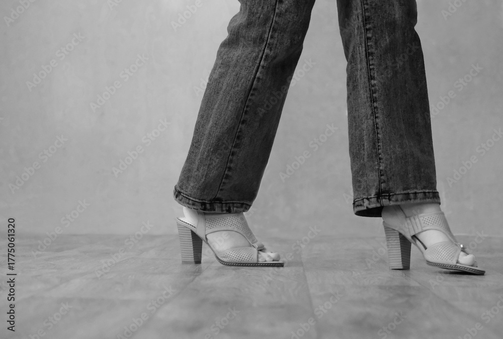 Slender female legs in elegant leather high-heeled beige shoes. Gray semi-wide leg jeans. Fashion and Style. Side view. Black and white, monochrome colors