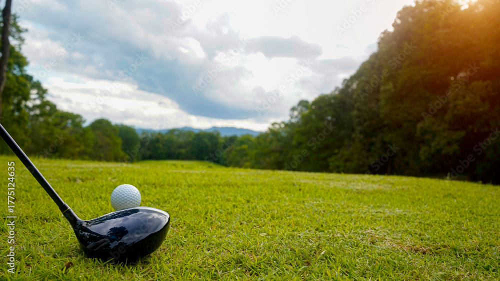 Golf clubs and balls on a green lawn in a beautiful golf course with morning sunshine.