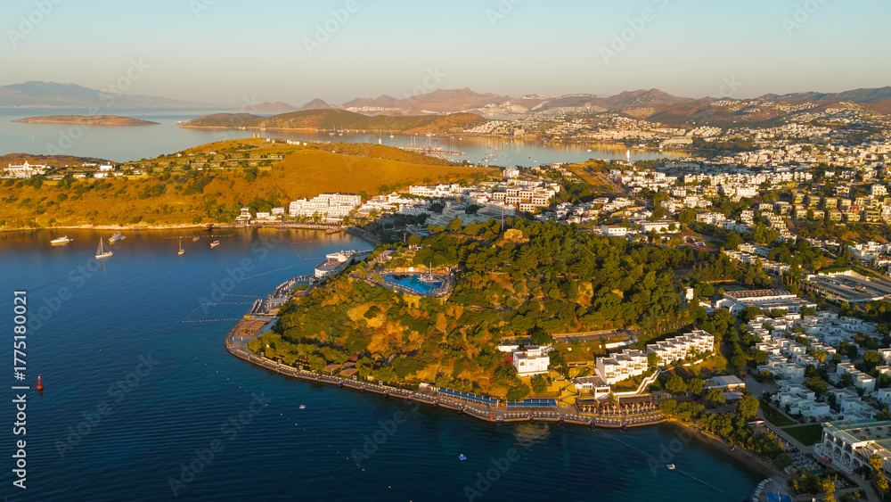 Bodrum, Turkey. Aerial drone view of forested hill with Tiger Tower in bright warm sunlight during morning hours.. Aerial View
