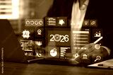 business using a tablet with holographic dashboards showing 2026, AI icons, to do list, charts, and KPIs representing business goals, planning, forecasting, data analytics, and digital transformation.