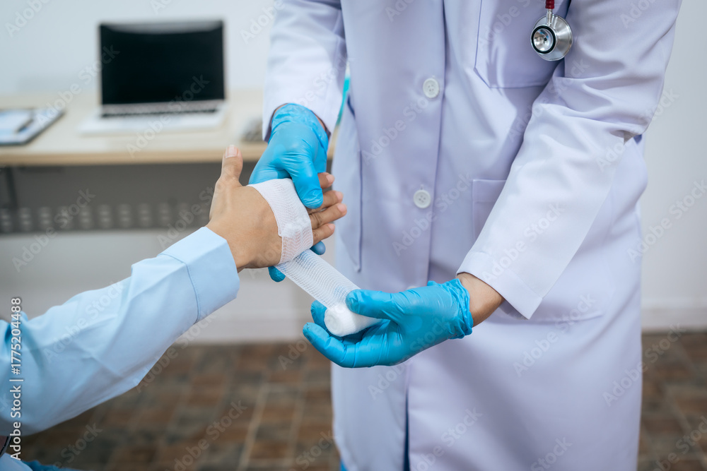 A male doctor gently examines and reassures an Asian female patient wearing a head bandage and neck brace after an accident,reflecting empathy, recovery care,professional medical support in a clinic