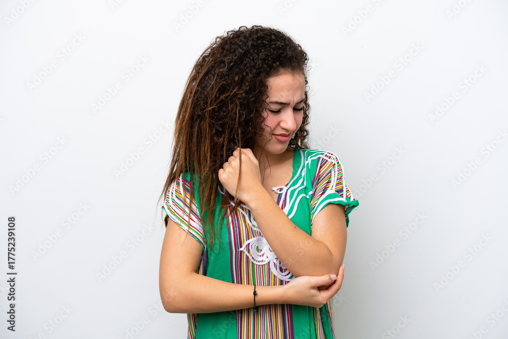 Young Arab woman isolated on white background with pain in elbow