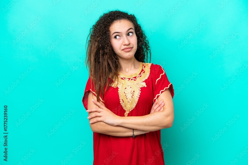 Young Arab woman isolated on blue background making doubts gesture while lifting the shoulders