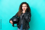 Young Arab woman with a motorcycle helmet isolated on blue background and looking up
