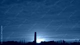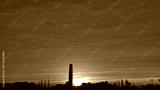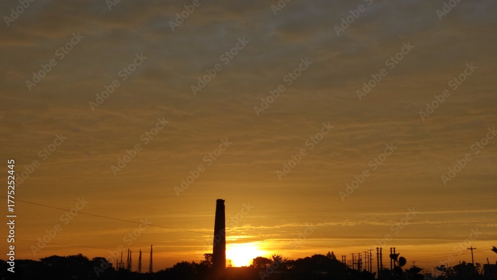 City sunset with an urban skyline and dark silhouette of buildings against a dusk sky filled with clouds