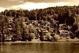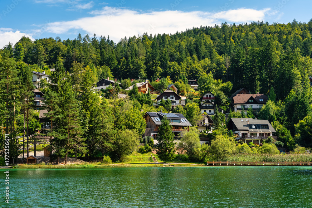 Mountain houses by Lake Kozorog at the foot of the Alps in the town of Kranjska gora, Slovenia.