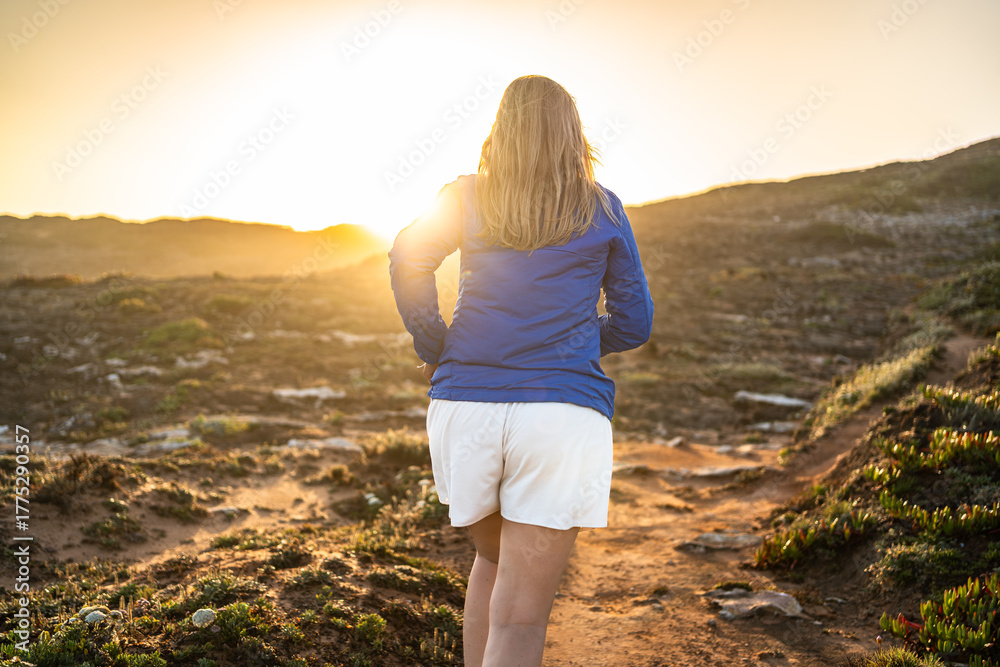 Beautiful middle-aged woman training jogging in mountains during sunrise in summertime. Back view