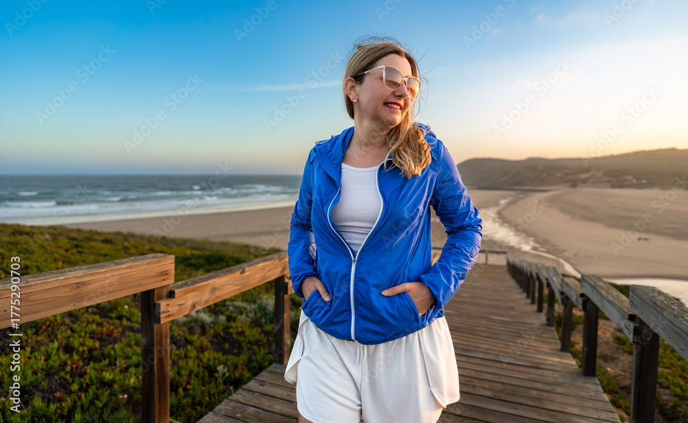 Visiting of Algarve coast in Portugal. Middle-aged woman tourist standing on stairs overlooking beautiful sandy beach and river Amoreira during sunrise in summer. Front view