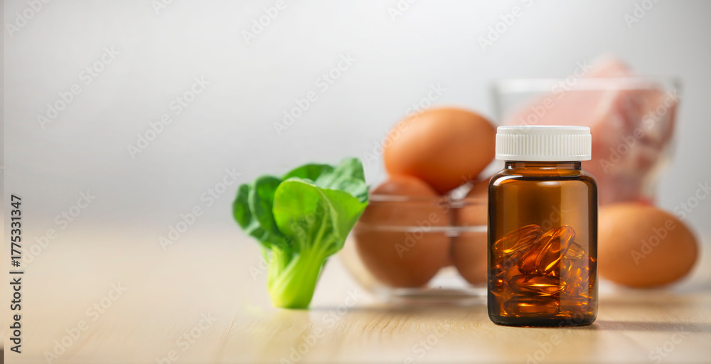"Vitamins and dietary supplements bottles on kitchen background, healthy lifestyle concept"