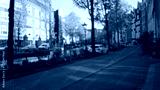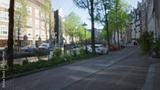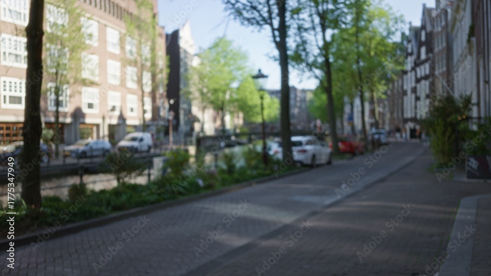 Blurry view of amsterdam streets with canals and buildings showcasing trees and cars under a clear blue sky in a defocused urban setting.