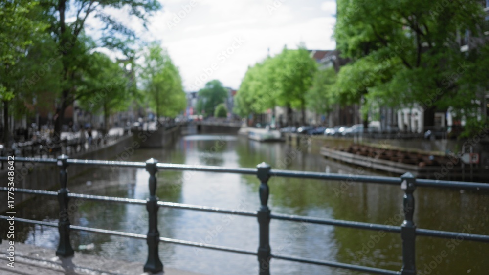 Blurred view of amsterdam canals with trees in the background, emphasizing defocused green leaves and a serene bokeh effect on a bright day in the netherlands.