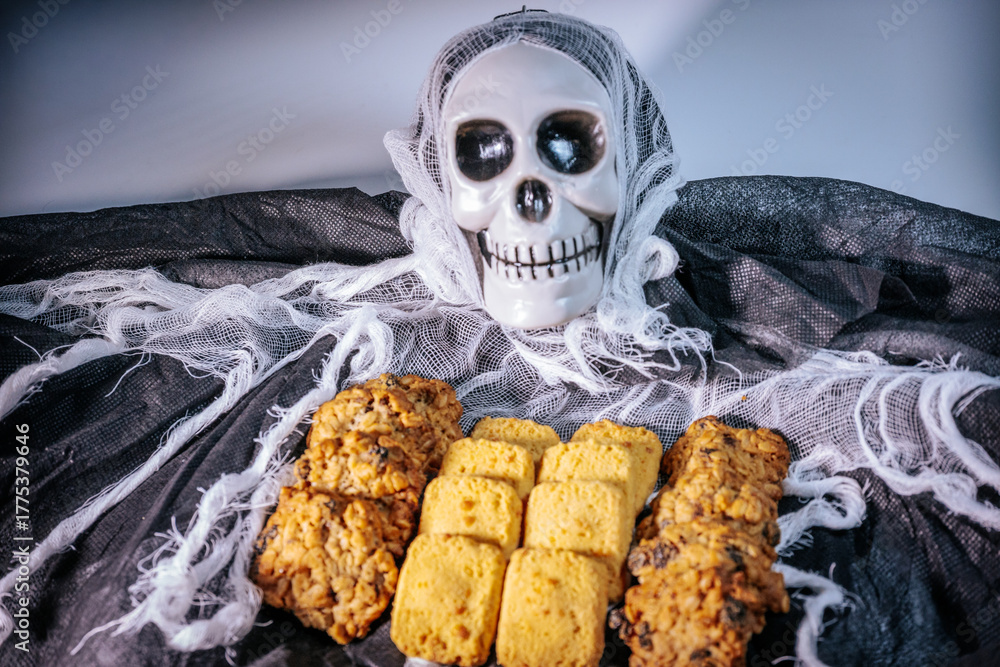 A close-up of golden rectangular butter cookies and thick oatmeal raisin cookies arranged on a dark cloth with a net in the background.