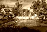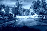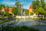 Main square and modern fountain in the Spa Park of Krynica Zdroj, Poland, surrounded by historic resort architecture.