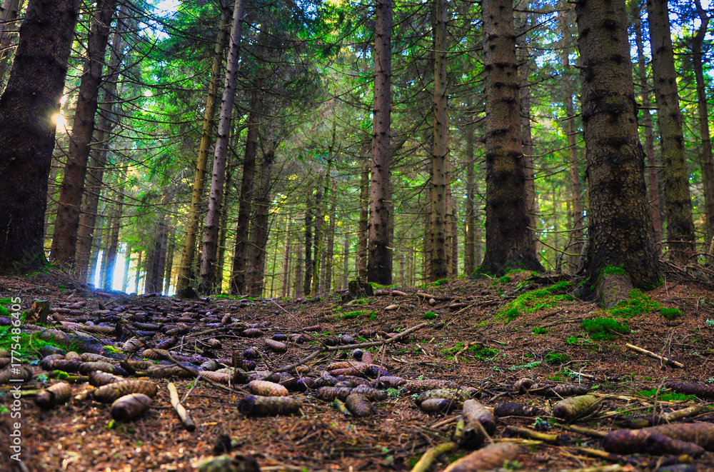 Oświetlona słońcem panorama lasu świerkowego z podszytem i szyszkami na ziemi. Spokojny widok natury lasu.