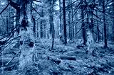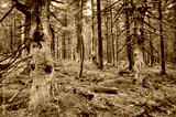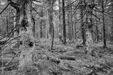 Rezerwat Przyrody "Dvorský les" w paśmie górskim Rychory w Karkonoszach. Krajobraz starego lasu z wysokimi świerkami powalonymi konarami i pokrytymi mchem pniami.