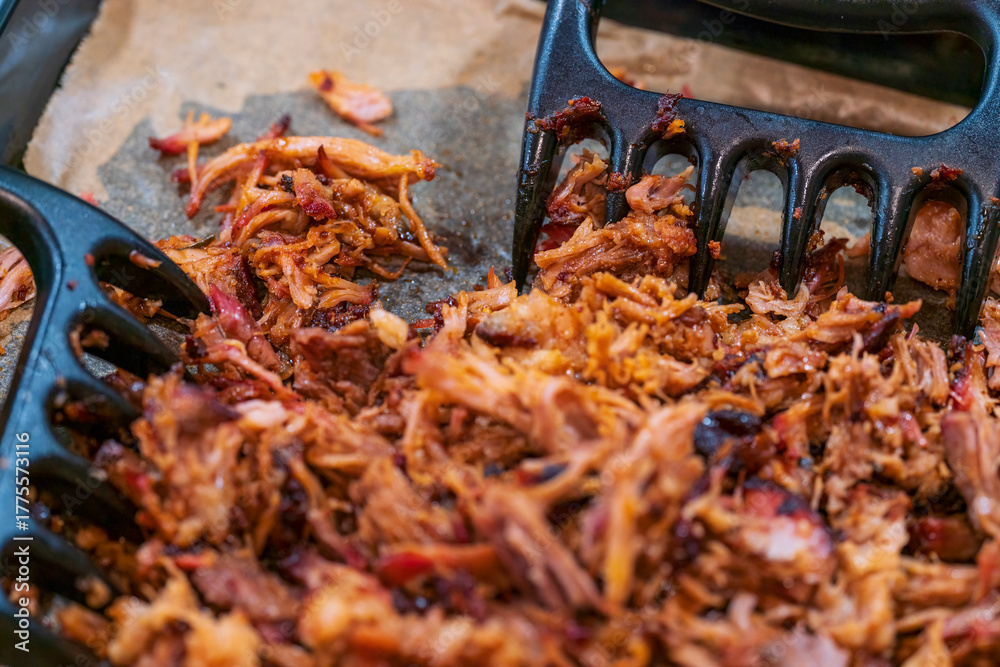 Pulled pork home made prepared in kitchen with fork in close up view