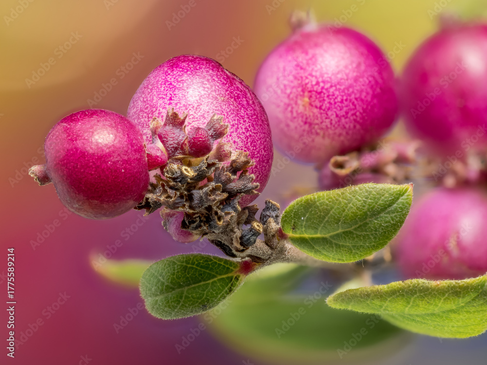 colorful Chilean golteria fruits, (Gaultheria mucronata), close up, macro on blurred delicate colorful background