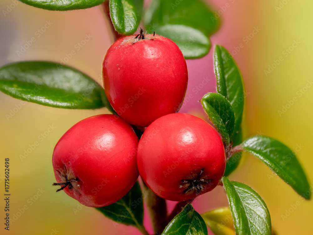 red fruits of the Cotoneaster plant (Cotoneaster Medik.), close up, macro on a blurred delicate colored background