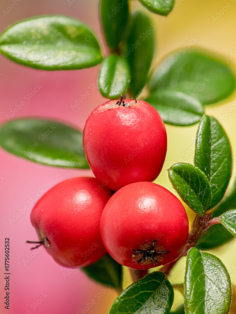 red fruits of the Cotoneaster plant (Cotoneaster Medik.), close up, macro on a blurred delicate colored background