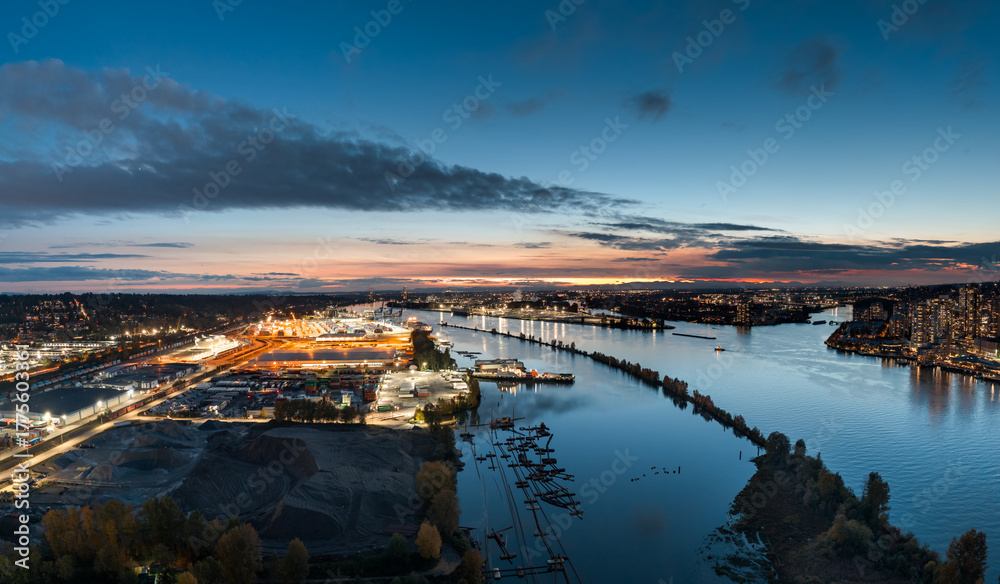 Aerial Sunset Over New Westminster Port, River, and Cityscape in Greater Vancouver, Canada At Dusk