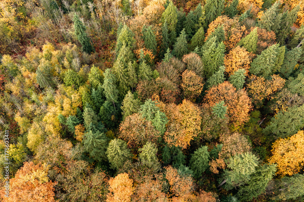 Aerial View of Vibrant Autumn Forest Canopy With Coniferous Trees in Burnaby, BC, Canada