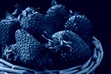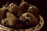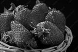Fresh ripe strawberries collected in a woven basket against a dark background, showcasing their vibrant red color and fresh green leaves