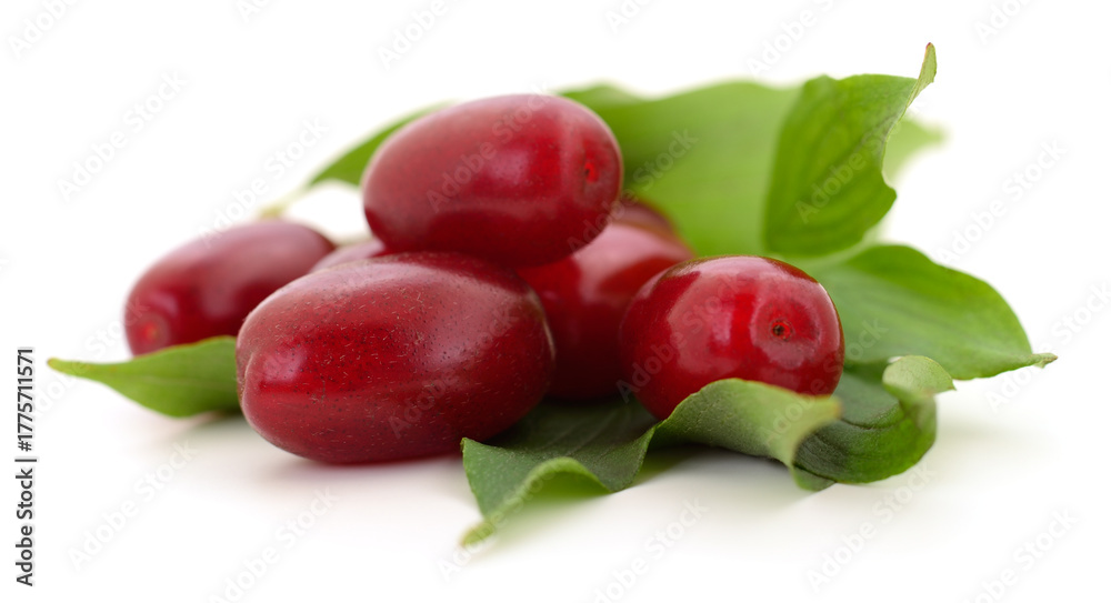 Fresh cornelian cherries with green leaves isolated on white background