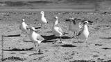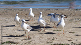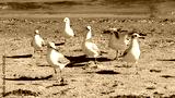 Seagulls gather on sandy beach, enjoying the warm sun near the shoreline