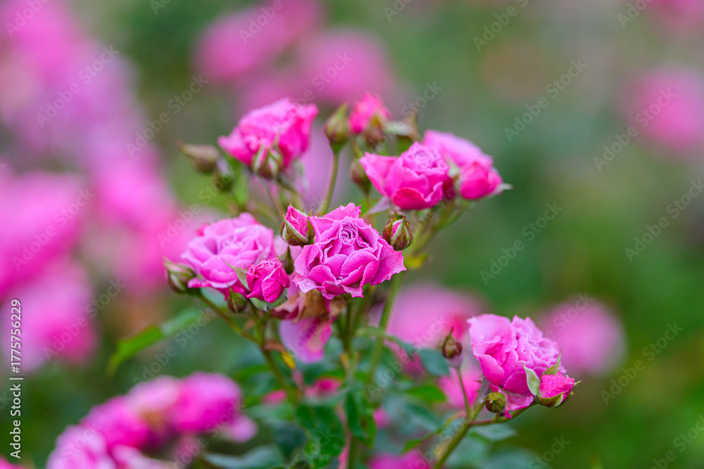 Beautiful blooming pink roses in the garden, close-up of fresh rose flowers with green leaves, natural floral background, romantic summer blossom, macro nature photography