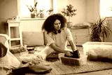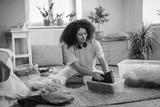 Young woman sorting wardrobe indoors at home, charity donation concept.