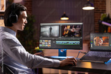 Asian sound and video editor working at apartment desk, reviewing cinematic footage for storytelling projects. Young man having productive editing session with syncing, color grading and sound design.